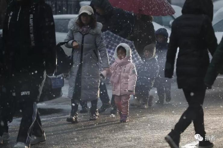 昨日,双桥,家长在雪中送小朋友去幼儿园。拍摄/新京报记者 侯少卿
