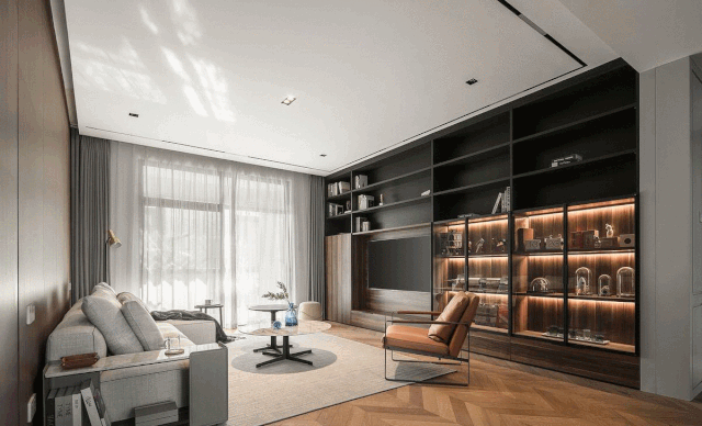 屋主期望客厅简练大气,因而沙发布景做了减法,电视墙规划整面柜体,展现一家人保藏的模型书本等。
