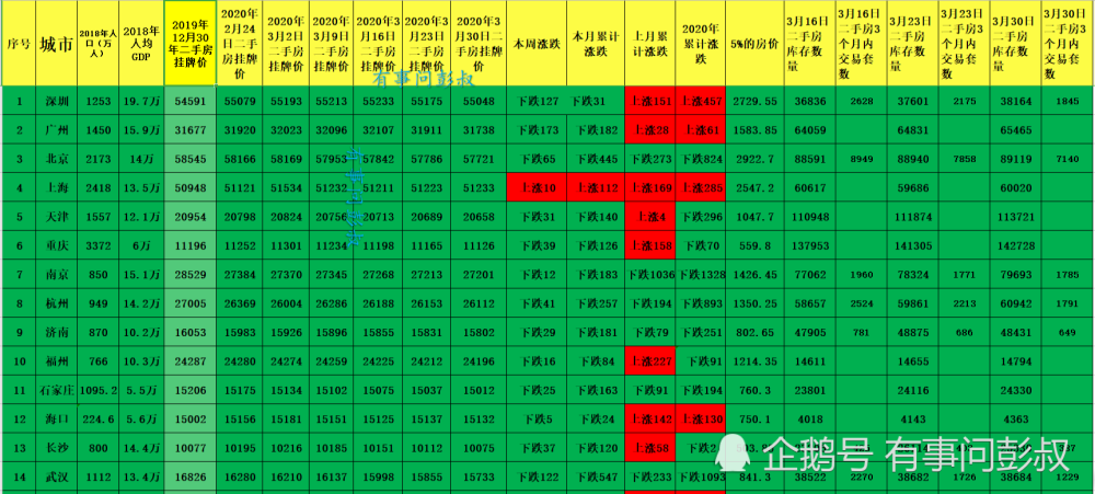 2020年3月全国一线城市、直辖市、省会城市房价数据出炉,本周31个城市里边,挂牌价上涨的仅有2个,挂牌价跌落的有29个,根本全绿。其间: