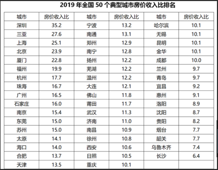 房地产永远是一个让人们讨论不绝的话题,它既是栖身之所,也是财富的象征,据统计多个方面数据显示,目前我国家庭住房资产占总资产比例高达77.7%,许多家庭耗尽几代积蓄外加贷款才能在城市中购买一套房产,高房价让不少人诟病,尤其是那些贫困家庭的孩子,为了能够在城里有一个属于自己的栖身之所,天天盼望着房价下跌,来看看中国主要城市的房价收入比: